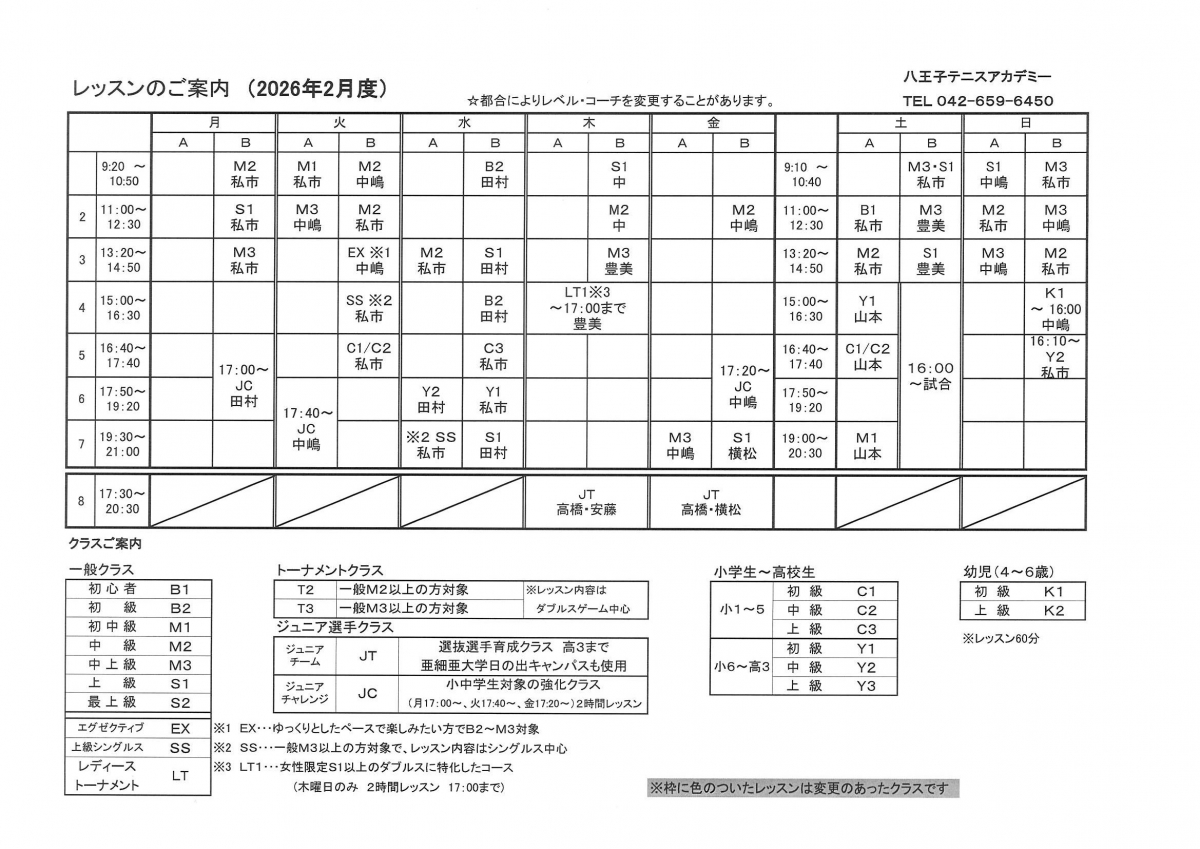 すべて ジュニアチチャレンジ スケジュール 大会風景 最新チラシ 特別イベント ジュニアチーム・ジュニアチャレンジ JT・JCページ 紹介キャンペーン レディーストーナメントクラス 2024 月例イベント情報 ジュニアイベント キャンプ 限定イベント 2026/02/01 ジュニアチチャレンジ 2026年新設ジュニアチャレンジ体験受講者及び所属選手募集中!!練習量が違うから短期間でぐんぐん上達!ただいま新規受講生大募集!!詳しくは:042-659-6450 までお問合せ下さい 詳細 2026/02/01 スケジュール スケジュール2026年(2月)を更新致しました。 詳細 2026/01/31 大会風景 2026 ビギナーMIX 1月31日大会結果 詳細 2026/01/17 大会風景 2026 中級男子 1月大会結果 詳細 2026/01/13 大会風景 ハッピーホリデートーナメント ビギナーMIX 1月12日 大会結果 詳細 2026/01/10 大会風景 2026 中級MIX 1月大会結果 詳細 2025/11/30 大会風景 2025 中級男子D チーム戦11月30日大会 結果 詳細 2025/11/25 大会風景 ハッピーホリデートーナメント 中級男子S/ビギナーMIX 11月24日 大会結果 詳細 2025/11/16 大会風景 2025 中級女子11月大会結果 詳細 2025/11/09 大会風景 2025 中級男子 11月大会結果 詳細 2025/11/04 大会風景 ハッピーホリデートーナメント 100MIXD/ビギナーMIX 11月3日 大会結果 詳細 2025/11/02 大会風景 2025 中級MIX 11月大会結果 詳細 2025/10/17 大会風景 マンスリーレディースカップ チーム戦 10月15日(オープン)大会結果 詳細 2025/10/14 大会風景 ハッピーホリデートーナメント ビギナーMIXD 午前/午後の部 10月13日 大会結果 詳細 2025/09/16 大会風景 ハッピーホリデートーナメント 100MIXD/中級MIXD 9月15日 大会結果 詳細 2025/09/09 大会風景 2025 中級MIX 9月大会結果 詳細 2025/08/31 大会風景 2025 中級男子D チーム戦8月31日大会 結果 詳細 2025/08/22 大会風景 マンスリーレディースカップ チーム戦 8月20日(オープン)大会結果 詳細 2025/08/12 大会風景 ハッピーホリデートーナメント 100MIXD/中級男子S 8月11日 大会結果 詳細 2025/08/09 大会風景 2025 中級MIXD チーム戦 8月9日大会 結果 詳細 2025/07/27 大会風景 2025 ビギナーMIX 7月大会結果 詳細 2025/07/22 大会風景 ハッピーホリデートーナメント 中級MIXD/中級男子S 7月21日 大会結果 詳細 2025/07/08 大会風景 2025 中級MIX 7月大会結果 詳細 2025/06/19 大会風景 マンスリーレディースカップ チーム戦 6月18日(オープン)大会結果 詳細 2025/06/15 大会風景 2025 中級男子 6月14日大会結果 詳細 2025/06/08 大会風景 2025 中級MIX 6月大会結果 詳細 2025/05/25 大会風景 2025 中級MIXD チーム戦 5月24日大会 結果 詳細 2025/05/06 大会風景 ハッピーホリデートーナメント 100MIXD 5月5日 大会結果 詳細 2025/05/04 大会風景 2025 中級MIX 5月大会結果 詳細 2025/04/29 大会風景 2025 中級男子D チーム戦4月29日大会 結果 詳細 1 2 3 4 5